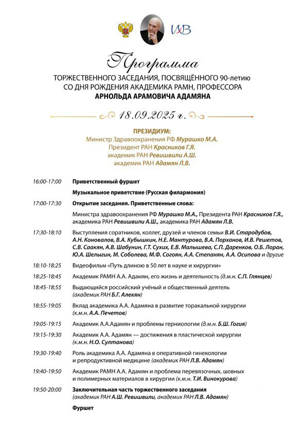 Торжественное заседание учёного совета, посвящённое 90-летию со дня рождения яркого представителя российской школы учёных–хирургов, новатора и изобретателя, талантливого педагога и умелого организатора Арнольда Арамовича Адамяна состоится 18 сентября 2025 года в НМИЦ хирургии имени А.В. Вишневского Минздрава России.